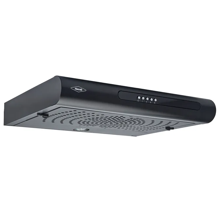 Campana para extracción de calor en cocinas, con diseño redondeando e iluminanción tenue según el momento.