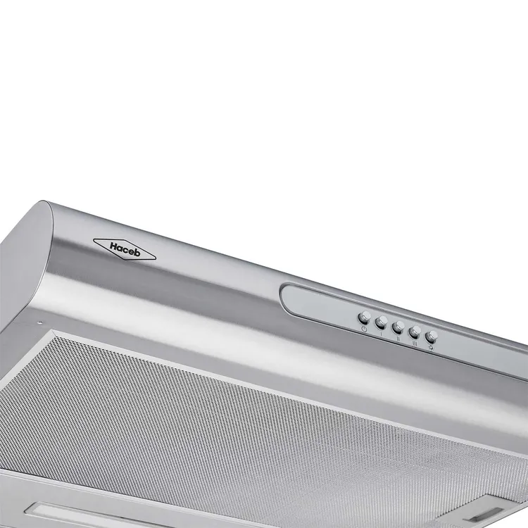 Campana en acero inoxidable para extracción de calor en cocinas, con diseño redondeando e iluminanción tenue según el momento.