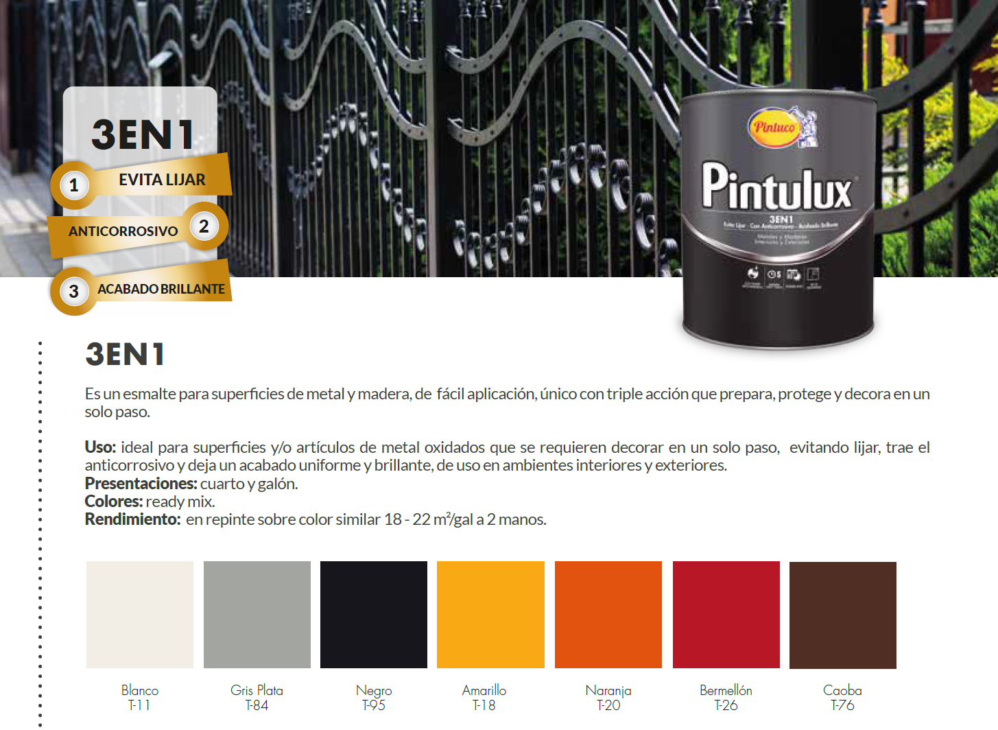 Esmalte alquídico que evita lijar en superficies con oxidación leve, contiene anticorrosivo y da un hermoso acabado mate. Diseñado para aplicar directo al metal con una excelente adherencia, durable y resistente a la corrosión. Prepara, protege y decora en un solo paso. Producto formulado sin plomo ni cromo. Recomendado para proteger y decorar superficies y/o artículos de metal y madera en ambientes interiores y exteriores como estructuras metálicas, puertas, portones, ventanas, rejas, marcos, etc.