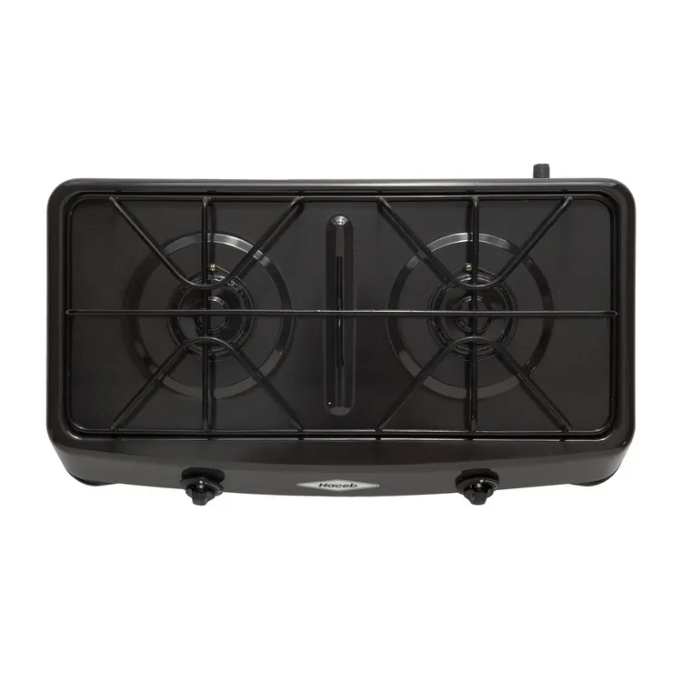 Estufa a gas propano de dos puesto con diseño sobre mesa.