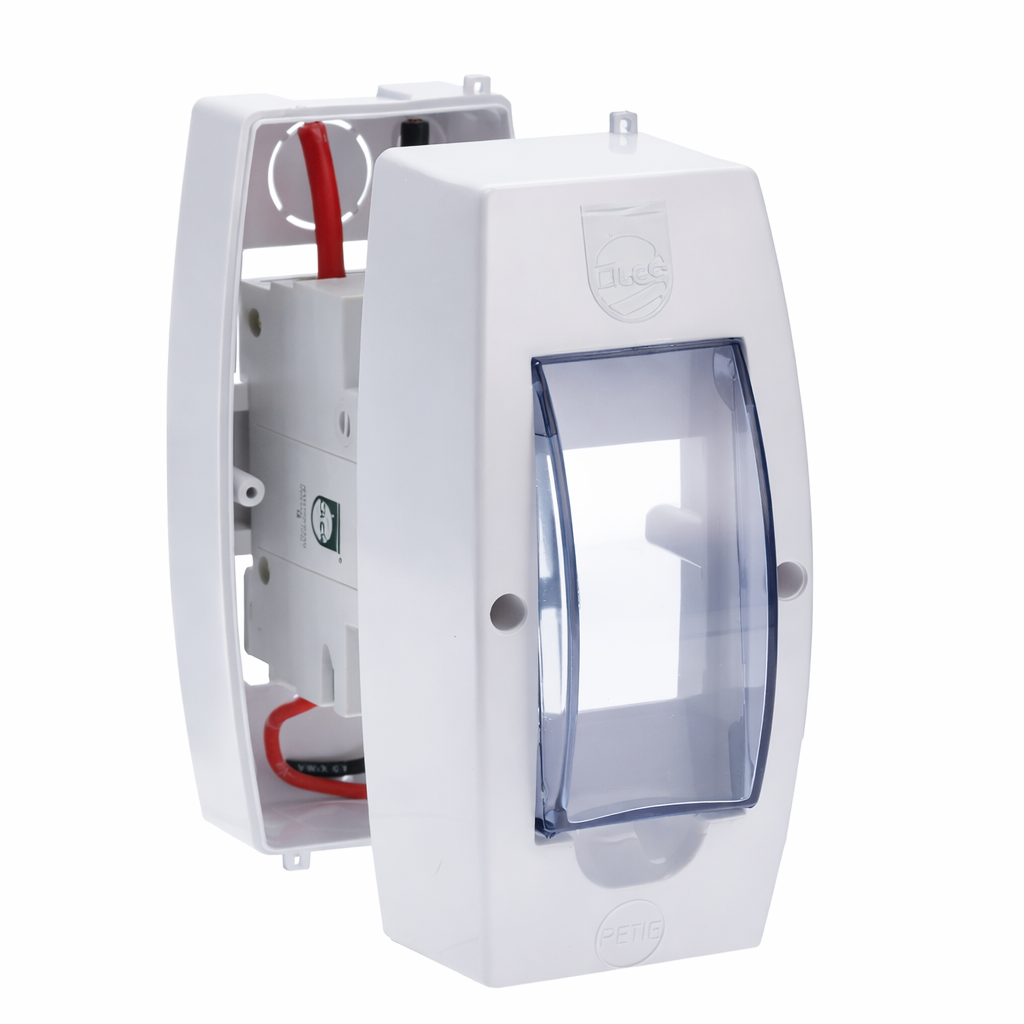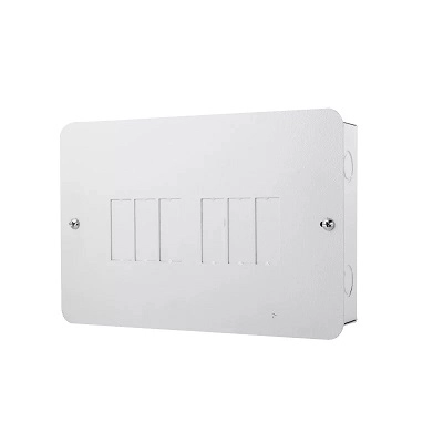 Tablero eléctrico de distribución fabricado en material metálico resistente, acabado en color blanco con superficie lisa y bordes redondeados. Diseñado para la protección y organización de circuitos eléctricos, cuenta con espacio frontal para interruptores automáticos y tapas modulares removibles para futuras ampliaciones.